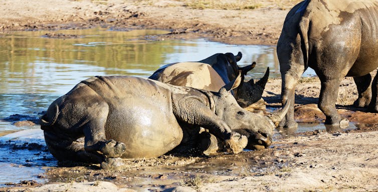 Rhinos cannot sweat. If they want to cool their large bodies down in the heat, they need to consume a lot of water. They also rely on wallowing in water holes and resting in the shade. As Earth heats up, rhinos will only survive if they have more opportunities to cool down.